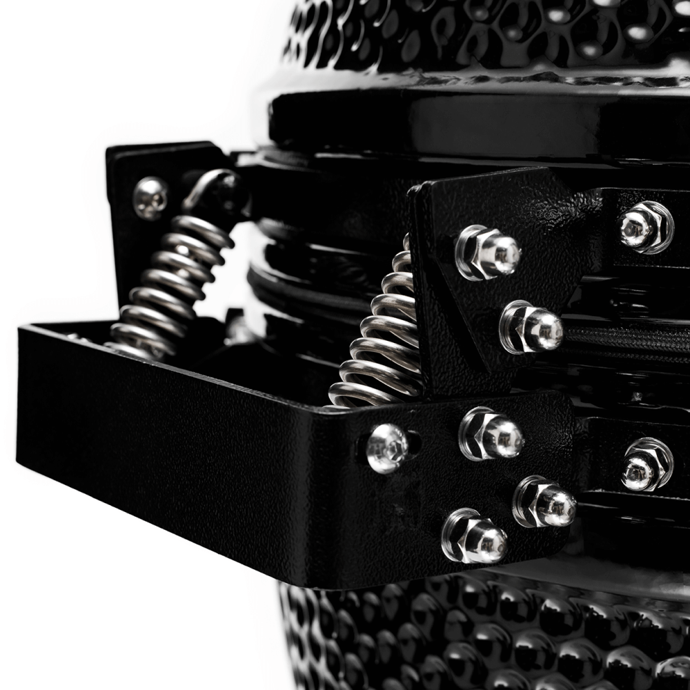 - Two-zone grilling system (2 halfmoon deflectors, kazan pot holder, stainless steel grate)
