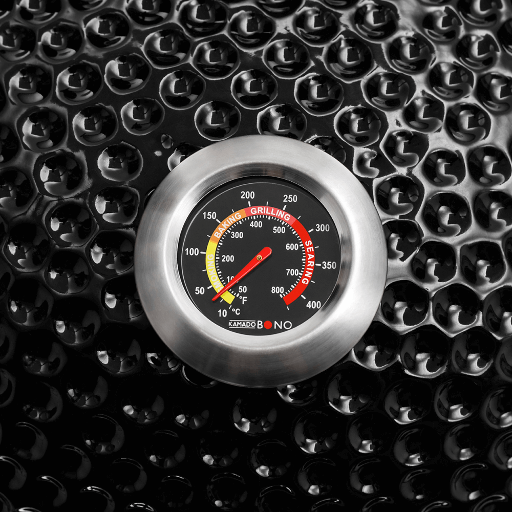 Kamado Bono Media Black – the ultimate 3-in-1 outdoor grill, oven, and smoker. Medium-sized and ideal for patios, terraces, or homesteads. Perfect for grilling, smoking, slow cooking, or pot/kazan cooking outdoors.