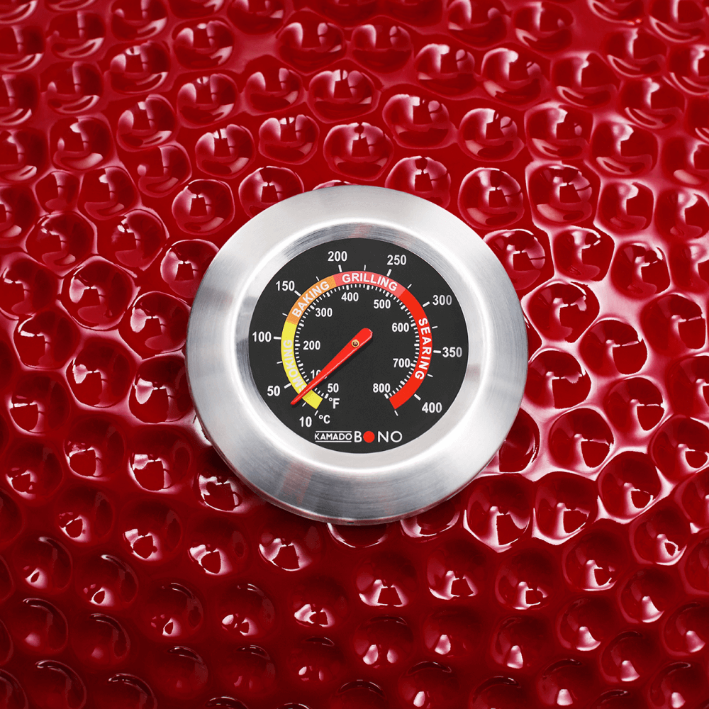 Kamado Bono Media Red – the ultimate 3-in-1 outdoor grill, oven, and smoker. Medium-sized and ideal for patios, terraces, or homesteads. Perfect for grilling, smoking, slow cooking, or pot/kazan cooking outdoors.